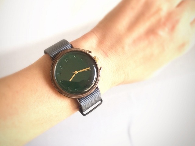 グリーンの文字盤にゴールドの針が落ち着いた印象ですが、グレーのナイロンベルトでカジュアル感もあり、普段使いにピッタリ!