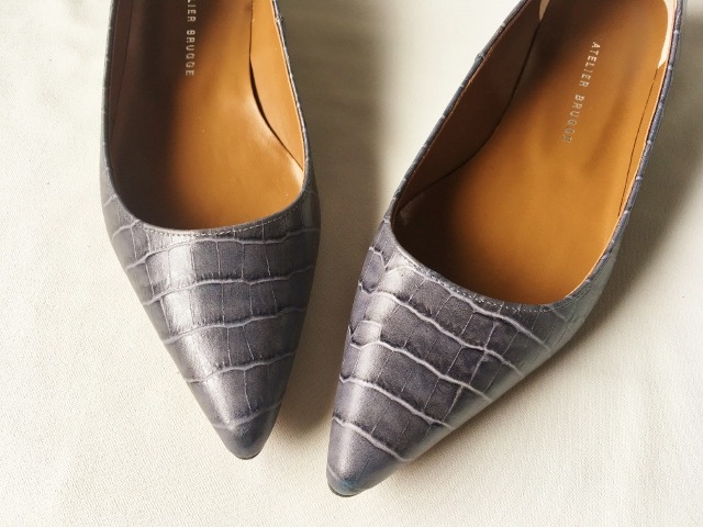 何点かあるatelier bruggeのシューズで、このパンプスを選んだ理由は、合わせやすいシックな色と、上品なデザイン、歩きやすいローヒールだからです。