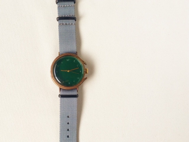 腕には大き目のグリーンの文字盤が印象的なメンズライクな時計でちょっと外して。