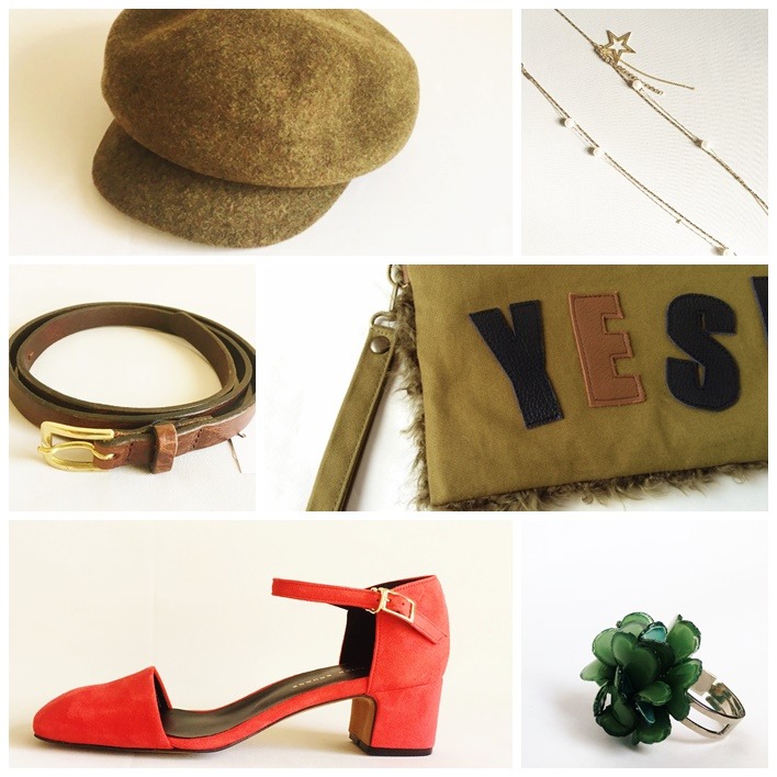 赤と相性の良いグリーン系の小物に、少しだけブラウンを取り入れることで全体がまとまります。