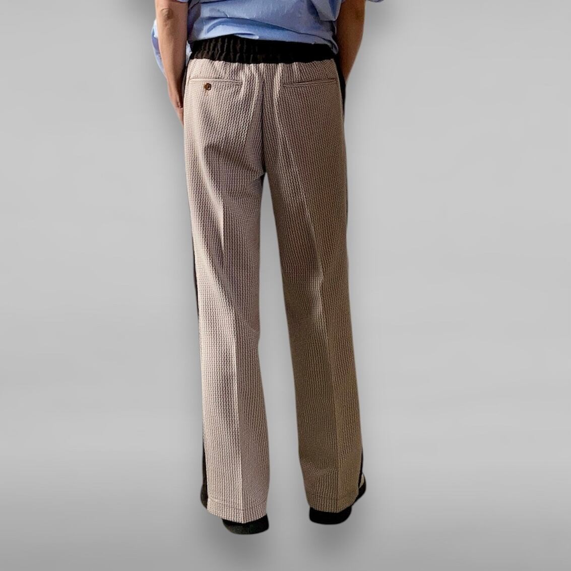 メンズの古着パンツをベースにし、サイドにデッドストックのテーラー生地をはめ込みました。