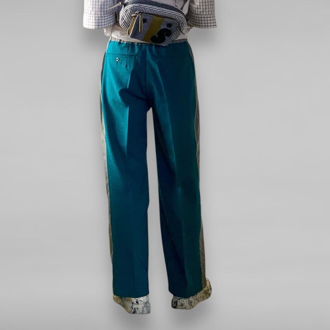 メンズのデッドスットックパンツをベースにし、サイドにデッドストックのテーラー生地をはめ込みました。