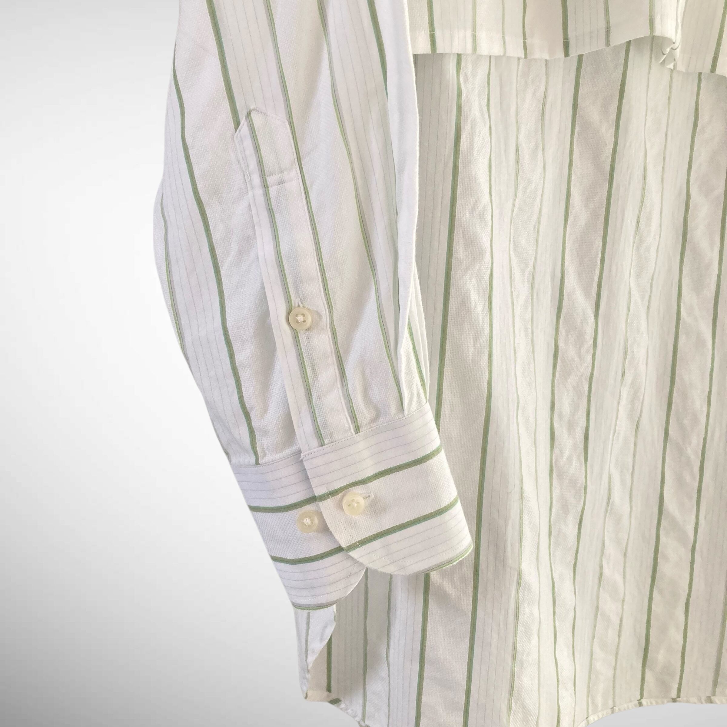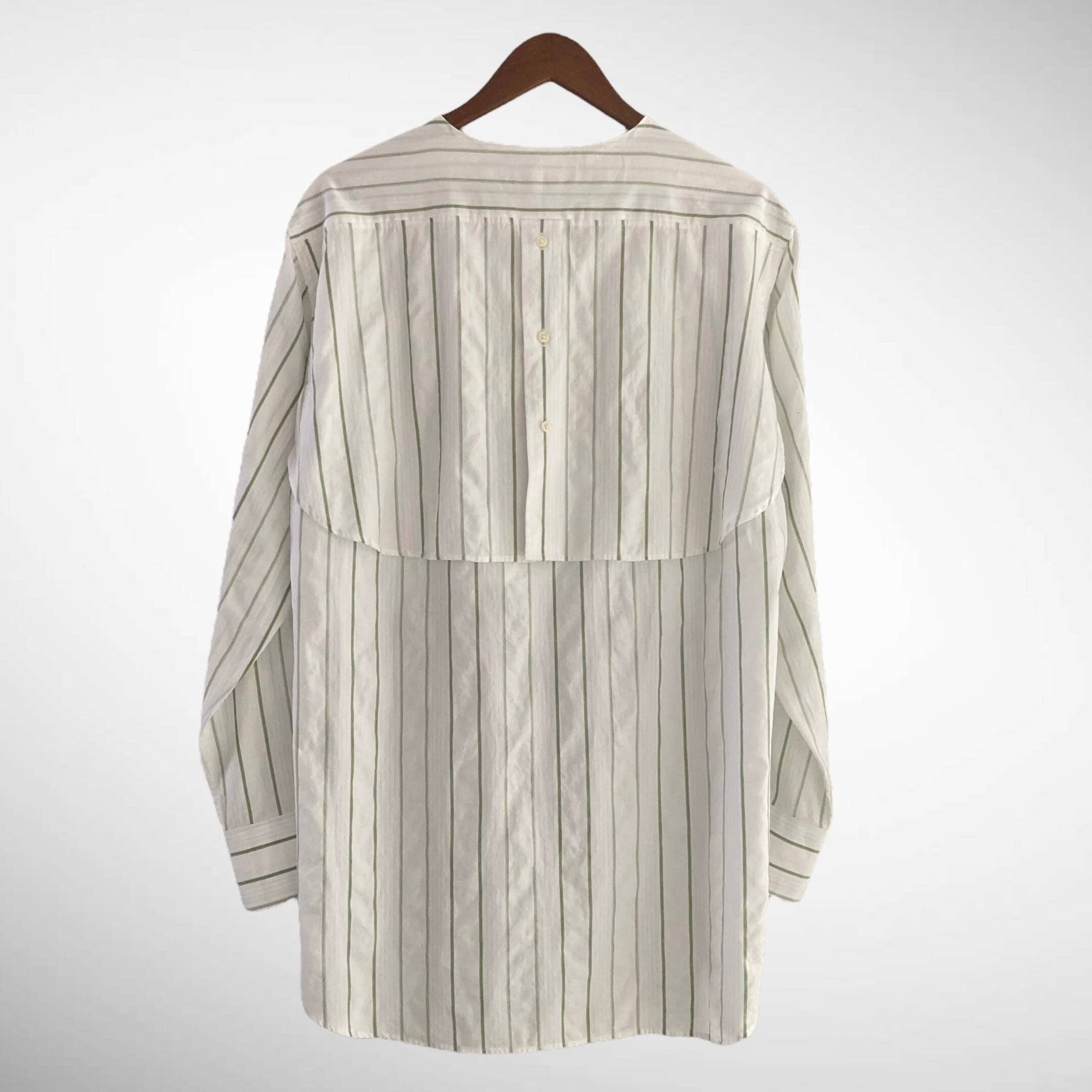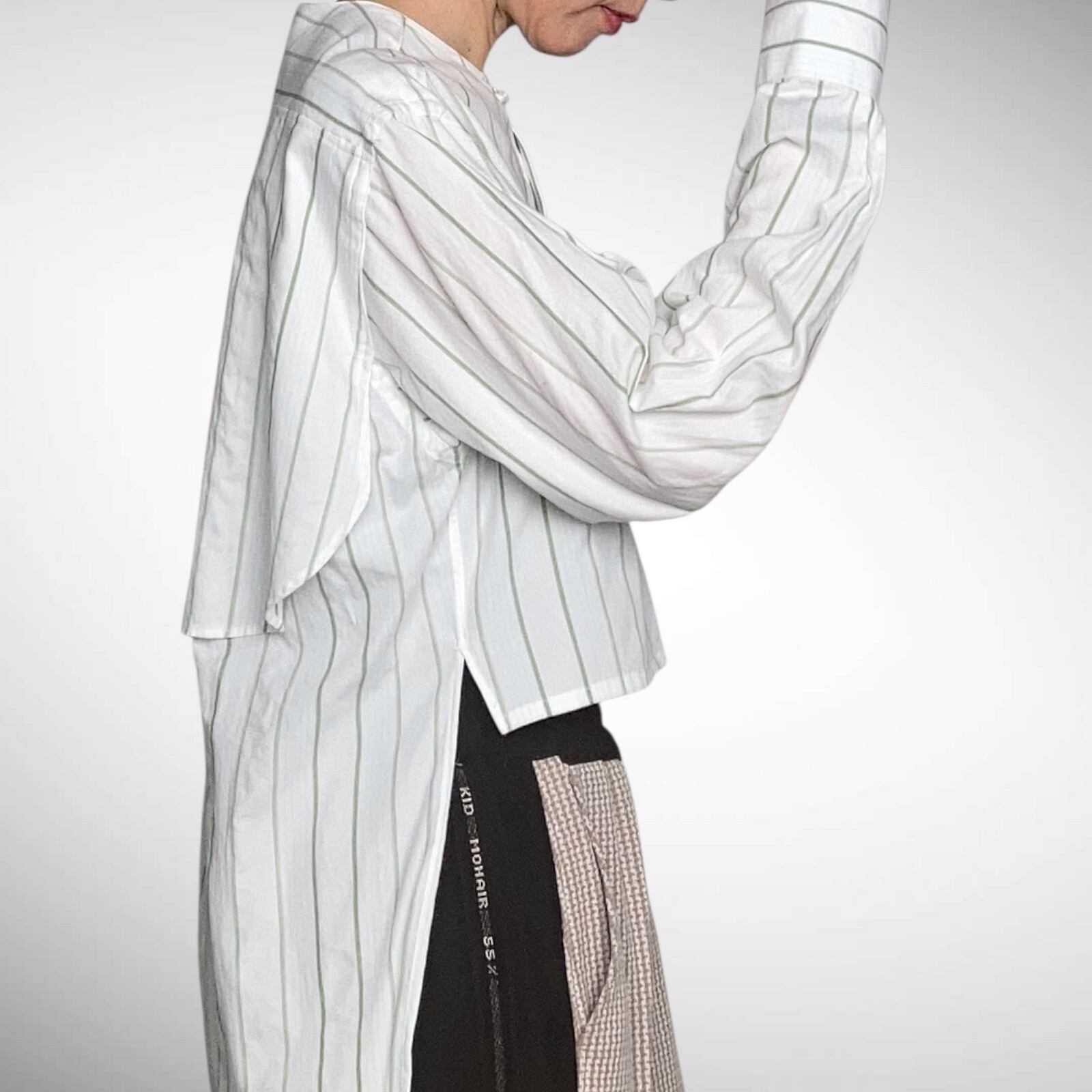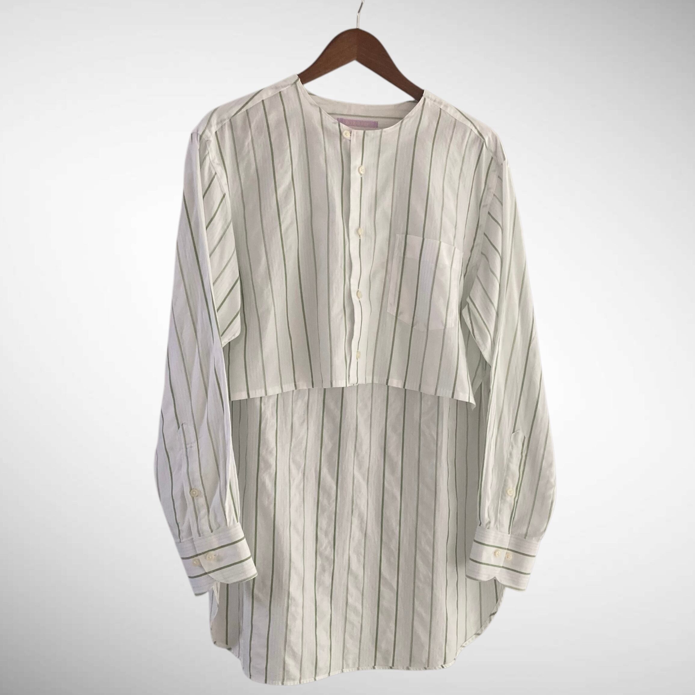 ZOZOTTE フロントショート丈 長袖シャツ/グリーン系ストライプ柄/古着リメイク/1点物