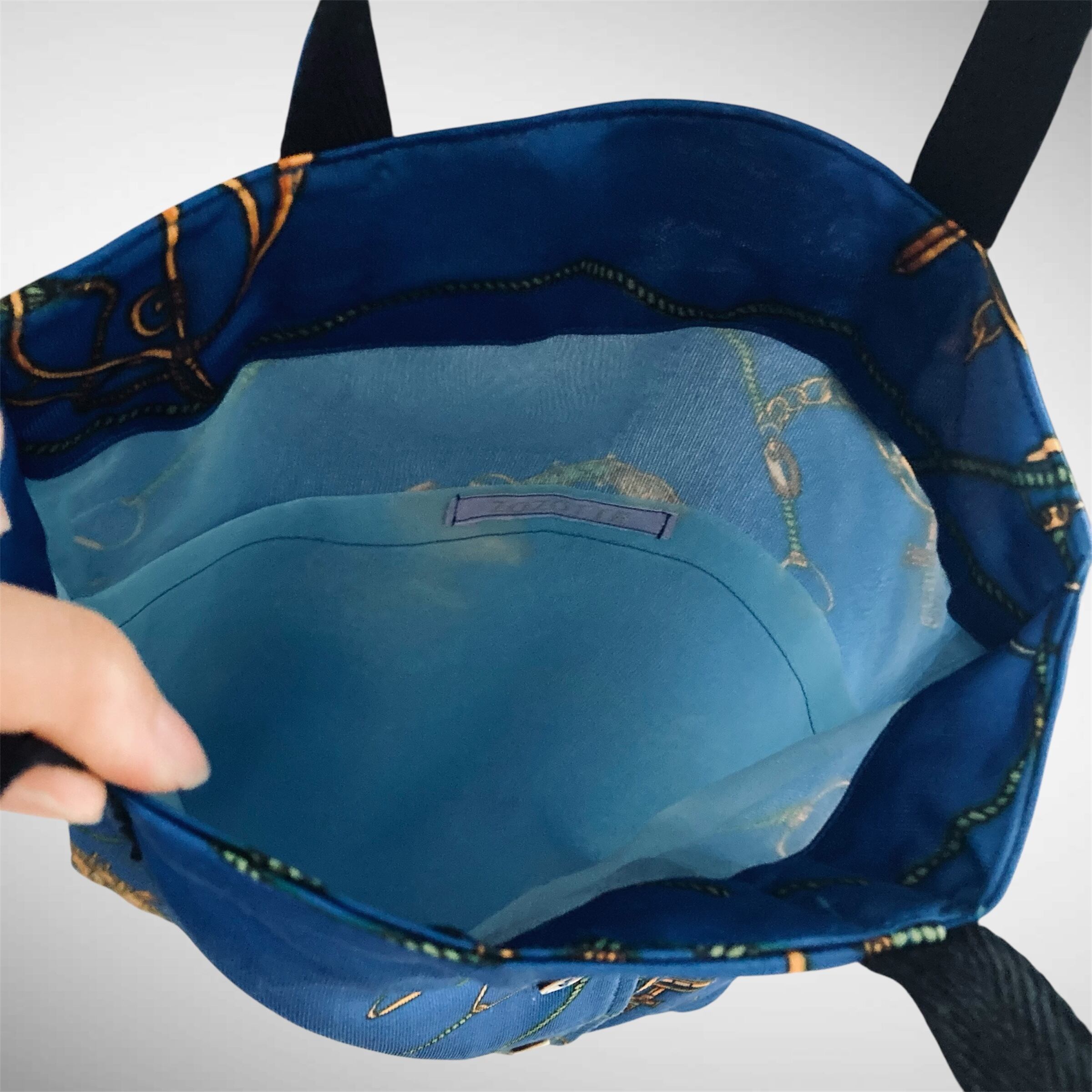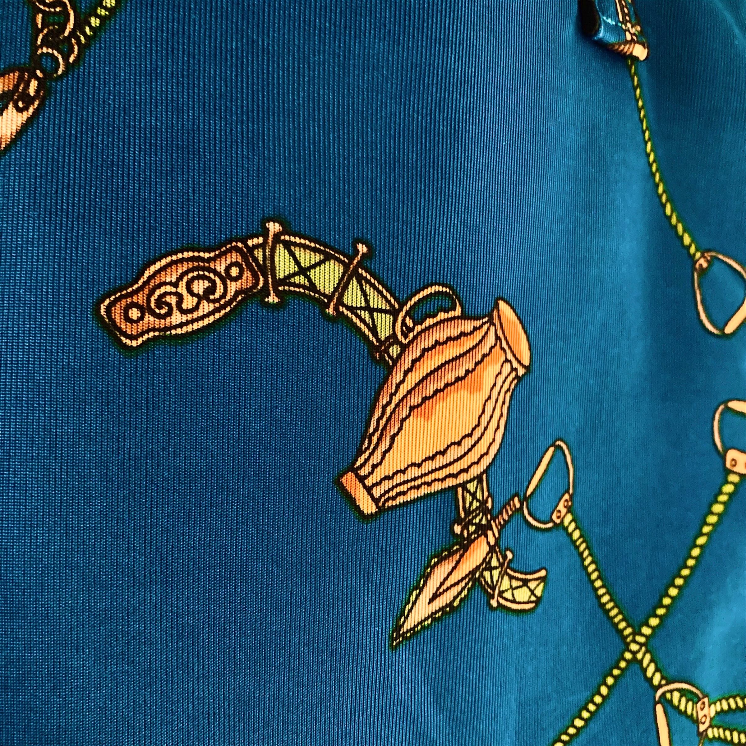 鮮やかなブルー地に、ロープやコンパス、馬具モチーフが描かれた上品な総柄が、コーディネートのアクセントに。