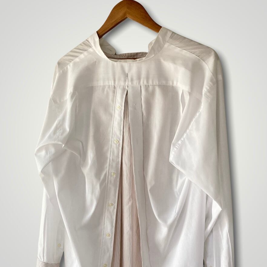 スタンドカラー、胸のダブルポケット、身頃の切り替え、バックのボックスプリーツなど、ディティールにこだわったユニセックスなシャツは、ひとつずつ手作業で作った1点物です。