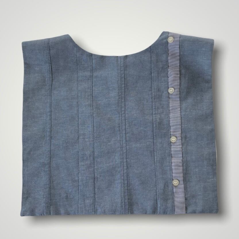 表側は、古着シャツの余り布を使用したパッチワーク、裏側はデッドストックのシャツ生地を使用したリバーシブルタイプです。